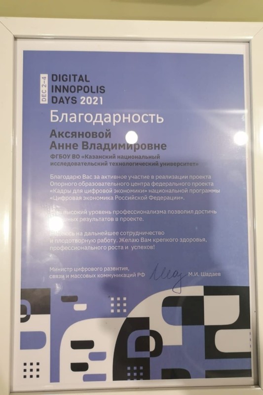 Команда КНИТУ получила награду на всероссийском цифровом форуме Digital Innopolis Days 2021
