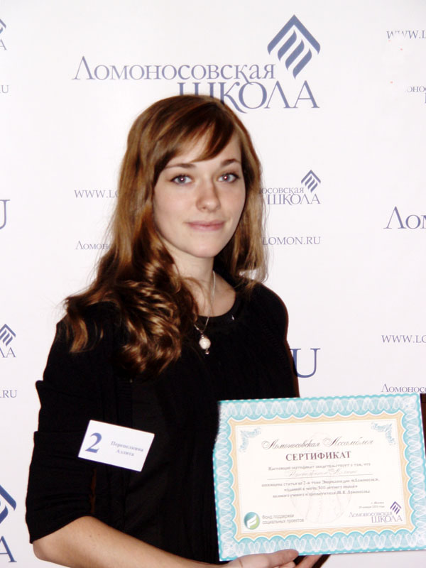 Сертификат о том, что Перепелкиной Аэлите посвящена статья в 3 томе Ломоносовской энциклопедии