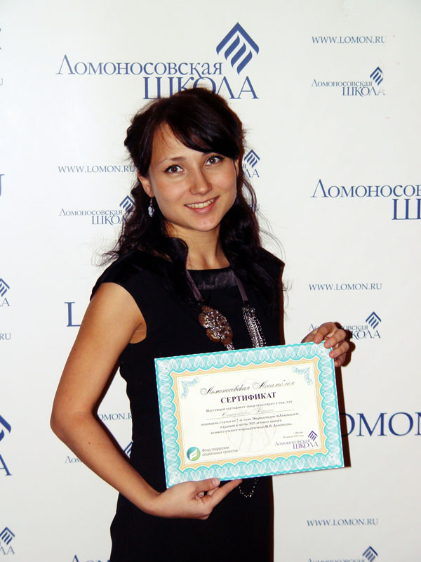 Сертификат о том, что Ситдиковой Карине посвящена статья в 3 томе Ломоносовской энциклопедии