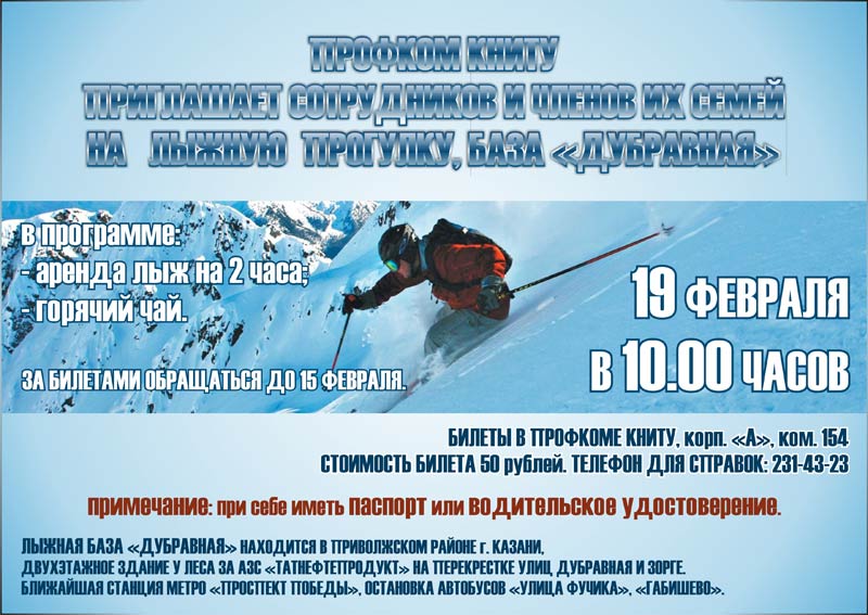 Профком КНИТУ приглашает сотрудников и членов их семей на лыжную прогулку на базе «Дубравная» 19 февраля в 10.00