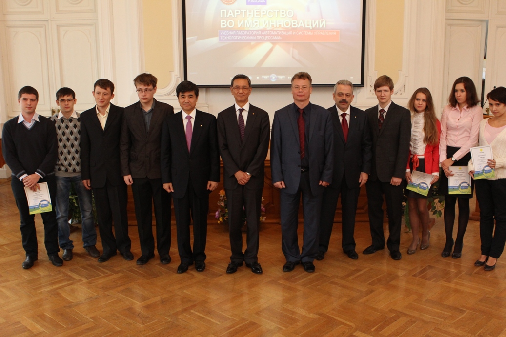 Президент, главный операционный директор «Yokogawa Electric Corporation» Такаши Нишиджима, председатель Правления - генеральный директор «Yokogawa Electric Corporation» Шузо Кайхори, ректор КНИТУ Герман Дьяконов с бакалаврами и магистрами факультета управления и автоматизации