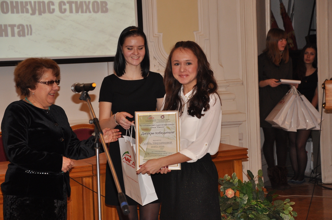 Первый вице-президент РМОО "Лига студентов РТ" Динар Бариев вручает благодарственное письмо одному из организаторов конкурса, активистке ССА КНИТУ Татьяне Гуляковой
