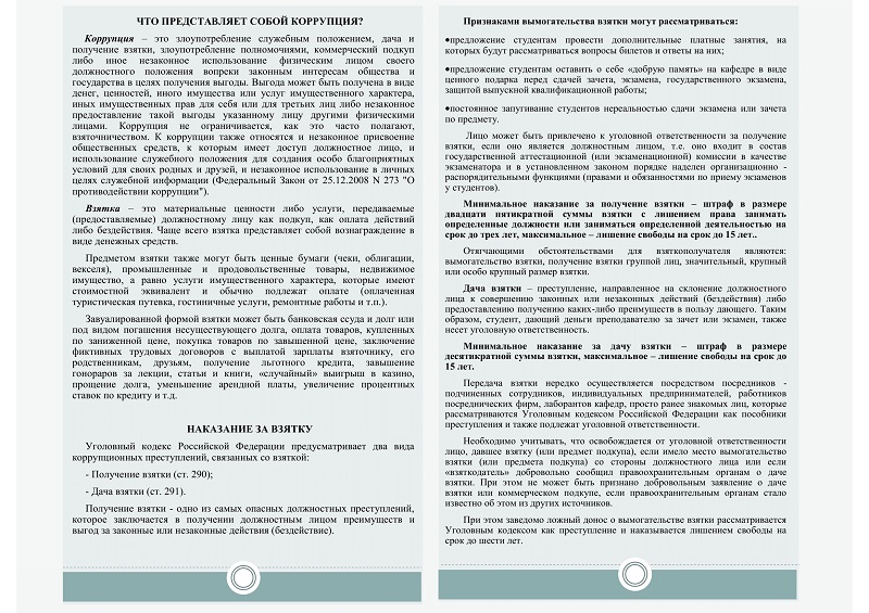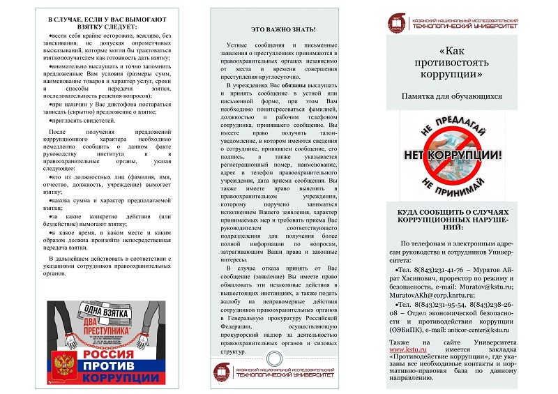 Осторожно, телефонные мошенники Конкурс видеопроектов на антикоррупционную тематику 10 декабря стартовал антикоррупционный конкурс фото/видео работ "Медиа против коррупции", целью которого является повышение уровня заинтересованности в изучении и понимании сути противодействия коррупции через создание медиа материалов. Конкурс проводится по 2 направлениям: Фото и видео. Для участия нужно сделать всего 3 шага: Работы принимаются до 26 декабря 23:59 Онлайн-выставка плакатов В рамках Дня борьбы с коррупцией студенты нашего учебного заведения организовали уникальную онлайн-галерею художественных работ, посвящённых проблемам коррупции. Эта инициатива направлена на формирование негативного общественного мнения относительно проявлений коррупции посредством выразительного художественного языка. Студенты отразили в своих работах важнейшие аспекты, такие как взятничество, должностные злоупотребления и необходимость придерживаться высоких моральных стандартов. Рисунки наглядно демонстрируют глубокое понимание проблем и желание внести вклад в борьбу с данным негативным социальным явлением. Онлайн-выставка является ярким примером творческого подхода к повышению уровня правового сознания молодёжи и способствует формированию осознанного неприятия коррупции в российском обществе. Акция «Как противостоять коррупции» 9 декабря, в честь Международного дня борьбы с коррупцией, состоялась акция, направленная на распространение тематических материалов среди студентов Казанского национального исследовательского технологического университета (КНИТУ). Цель мероприятия заключалась в информировании обучающихся о современных формах коррупции и методах противодействия ей. Особое внимание было уделено актуальной угрозе — кибермошенничеству. Студенты получили памятки, рассказывающие о таком явлении, как дропперы — пособниках преступников, помогающих незаконно получать и обналичивать деньги. Организаторы, активисты студенческого клуба профилактики КНИТУ, подробно разъяснили участникам мероприятия последствия участия в незаконных схемах и ответственность перед законом за подобные действия. Это позволило создать доступную форму предупреждения молодых людей о возможных рисках и правовых последствиях, подчеркнув важность осведомленности каждого гражданина в борьбе с коррупционными проявлениями. Акция стала важной частью образовательного процесса, напомнив учащимся о защите собственных прав и мерах предосторожности, необходимых для предотвращения вовлечения в противоправные схемы. Студентка КНИТУ отмечена на республиканском антикоррупционном конкурсе 5 декабря в Представительском корпусе Казанского Кремля прошла торжественная церемония награждения победителей ежегодных антикоррупционных конкурсов, приуроченных к Международному дню борьбы с коррупцией. Среди лауреатов оказалась Милена Викторова, студентка Института управления инновациями КНИТУ (кафедра ППО). Она одержала победу в республиканском конкурсе научно-прикладных исследовательских работ с проектом образовательного квеста «Завод без нарушений». Разработка была создана под руководством старшего преподавателя кафедры ППО Елены Маркиновой. Практическая реализация проекта состоялась 3 декабря в Поволжской государственной академии физиче