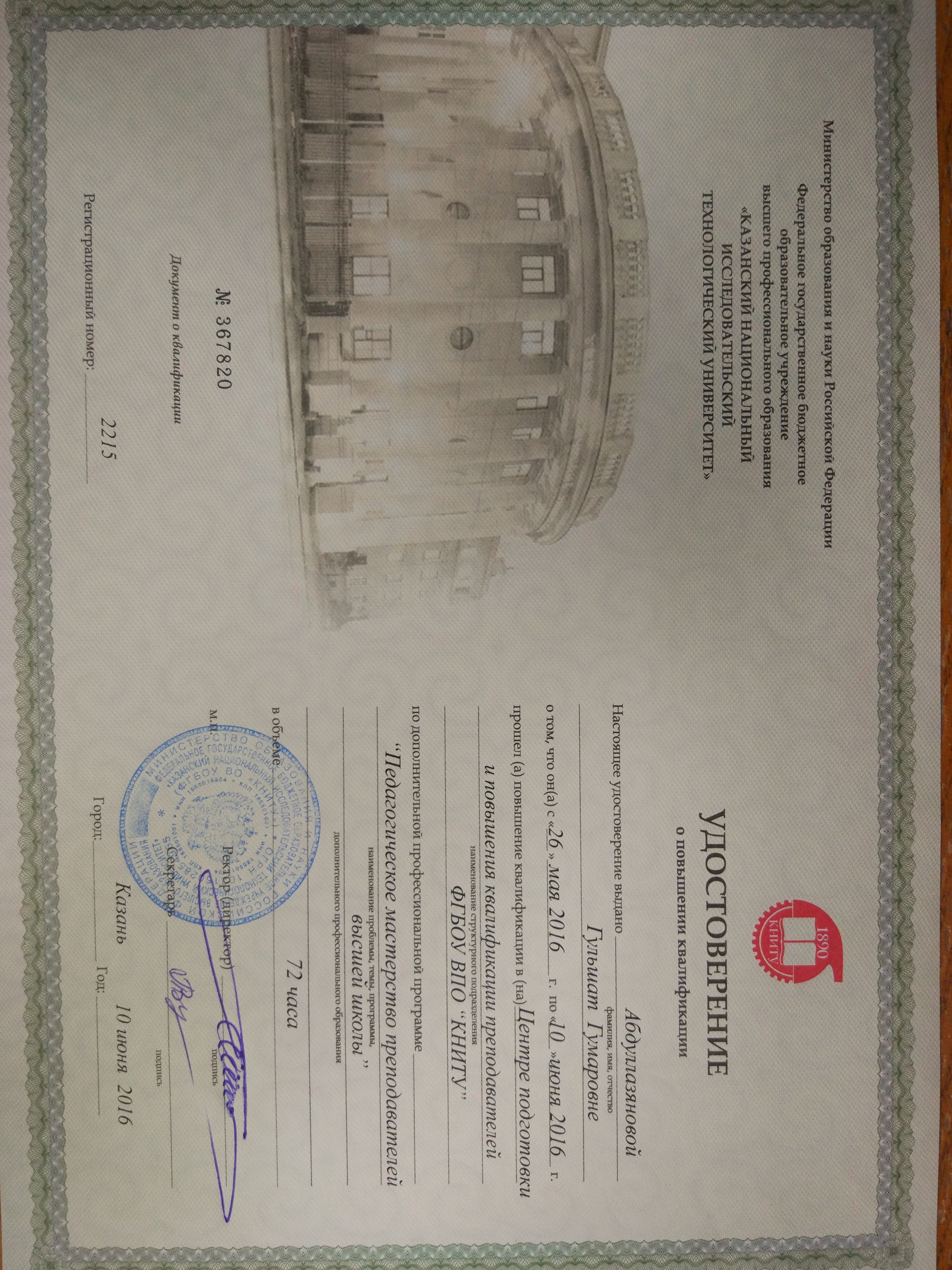 11.12.2023 - 26.12.2023, 24 час. Удостоверение о краткосрочном повышении квалификации, серия: ПК, номер: 495183. Выдан: ЦППКПВ. Программа: Педагогический артистизм преподавателя вуза в условиях цифровизации образования.