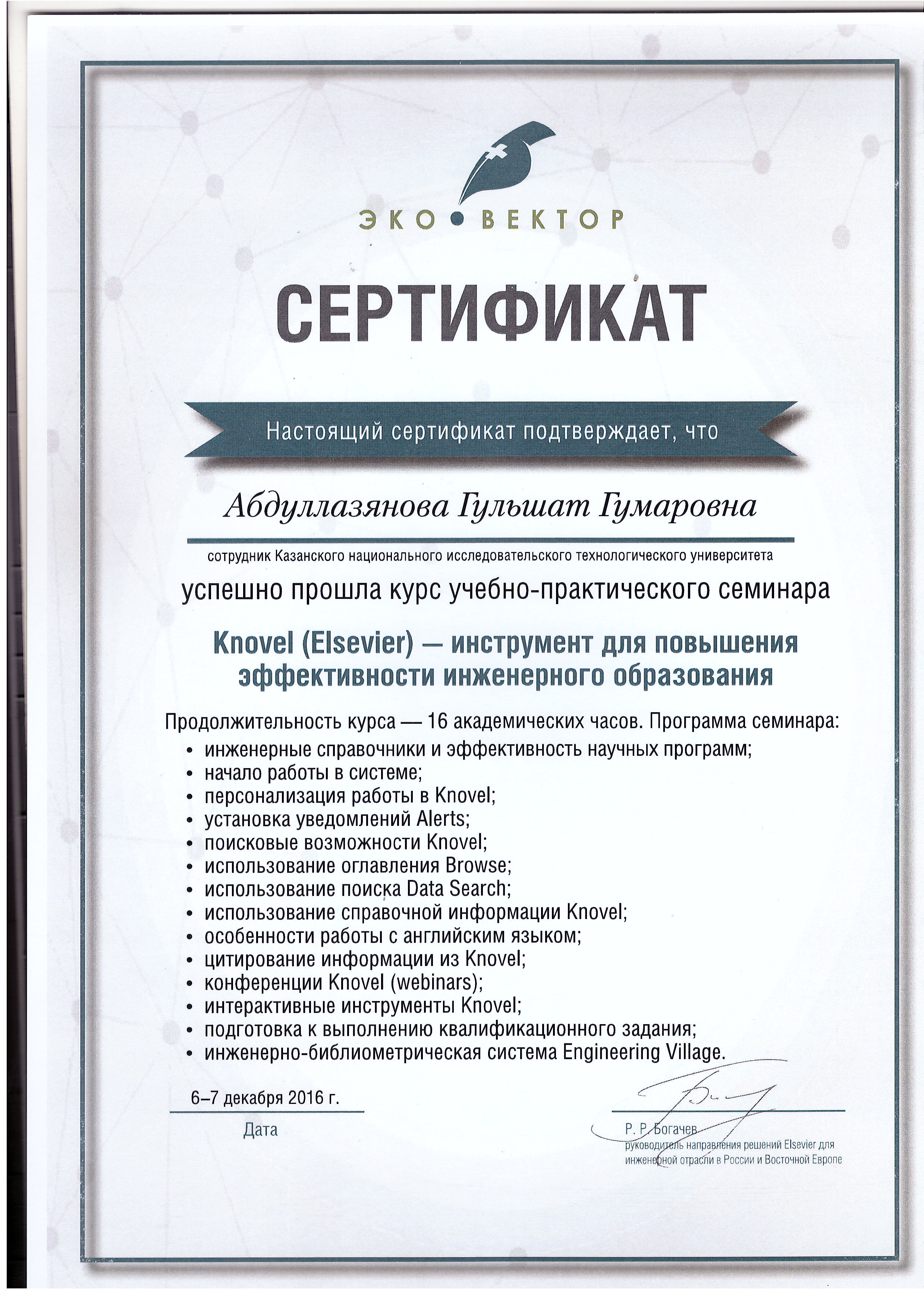 29.11.2024 - Удостоверение о краткосрочном повышении квалификации, номер: 80499. Выдан: Институт дополнительного профессионального образования ФГБОУ ВО "КНИТУ". Программа: Основные инструменты перехода к концепции индустрии 4.0 в нефтегазохимической отрасли.