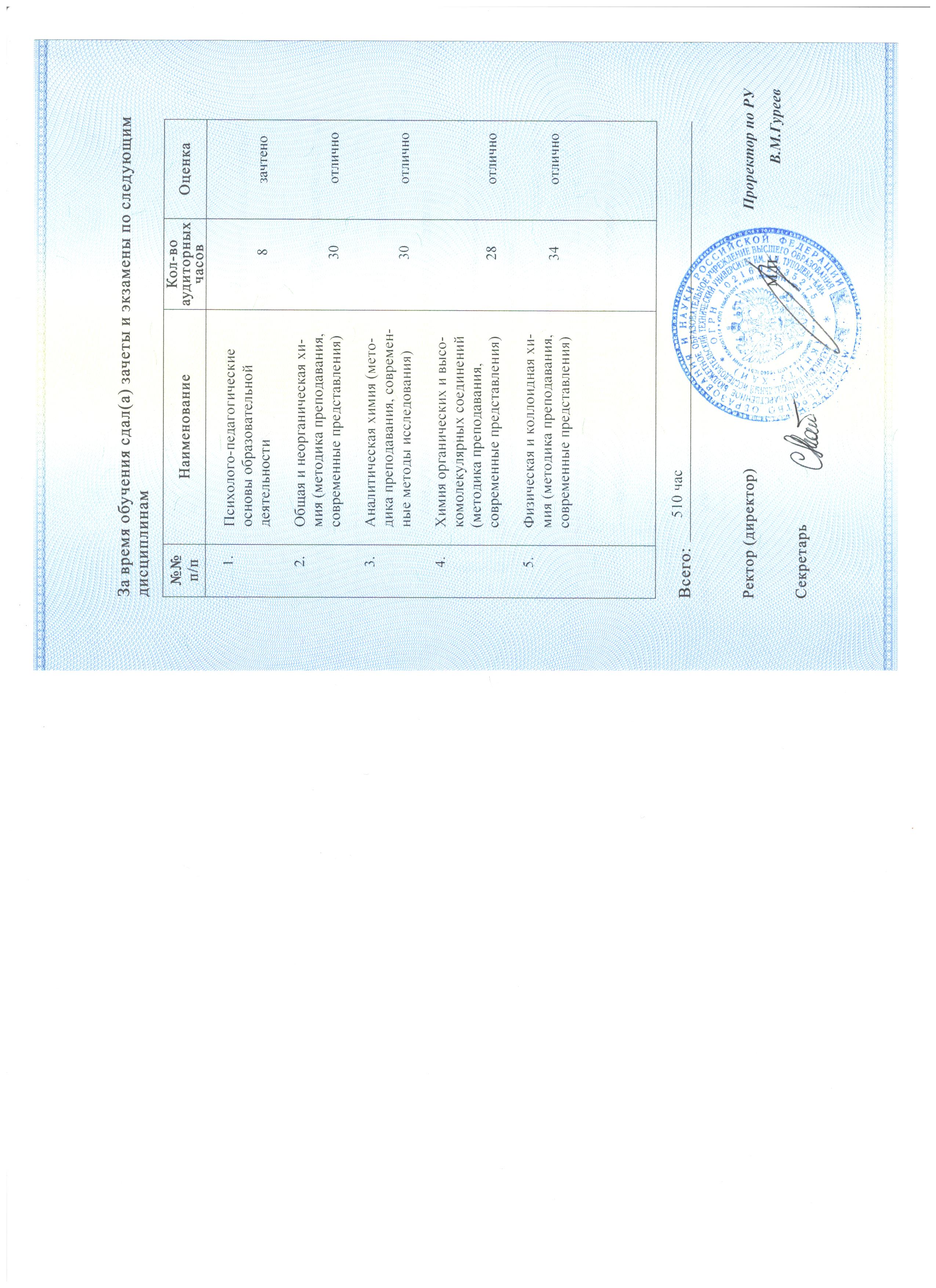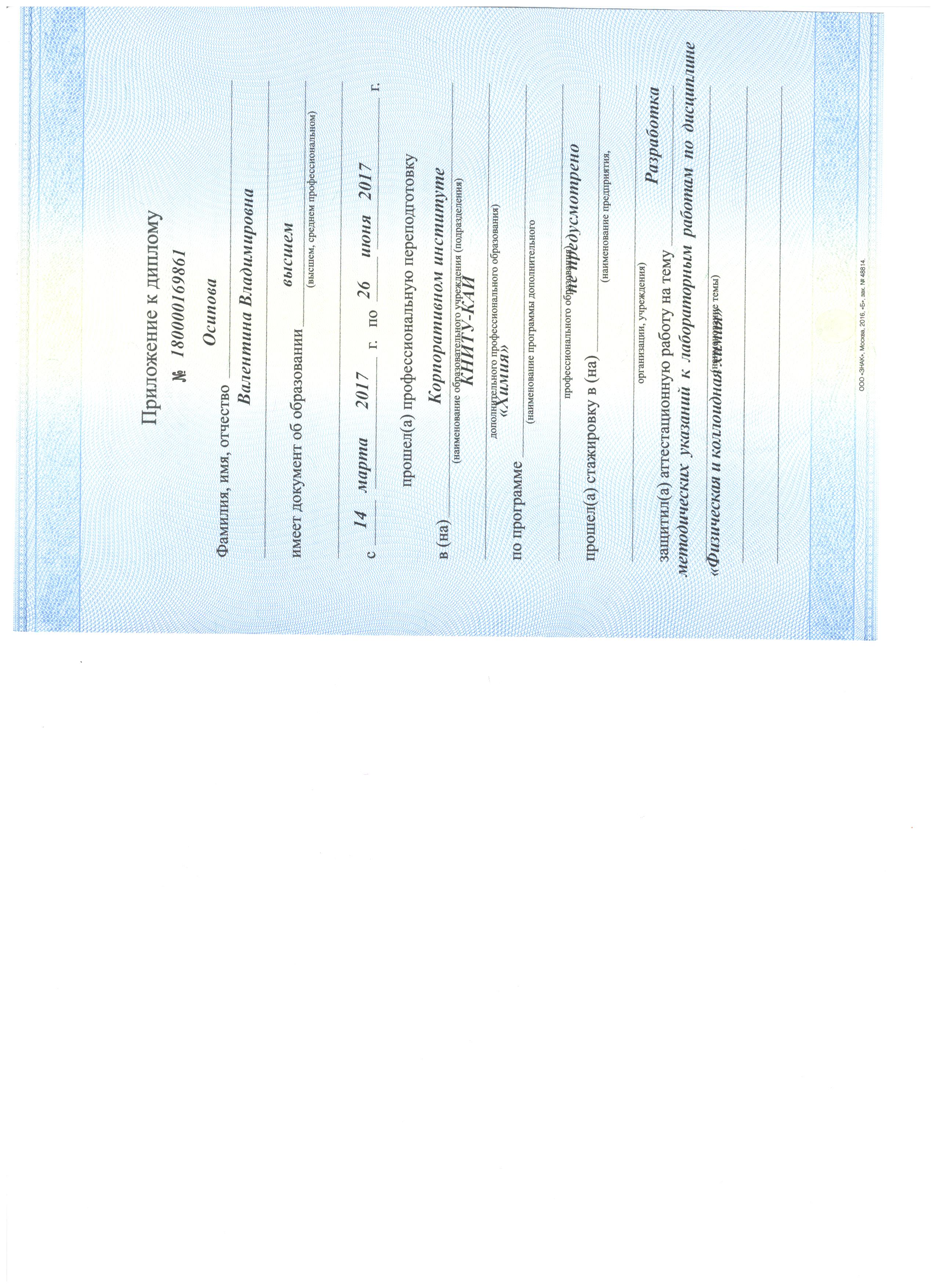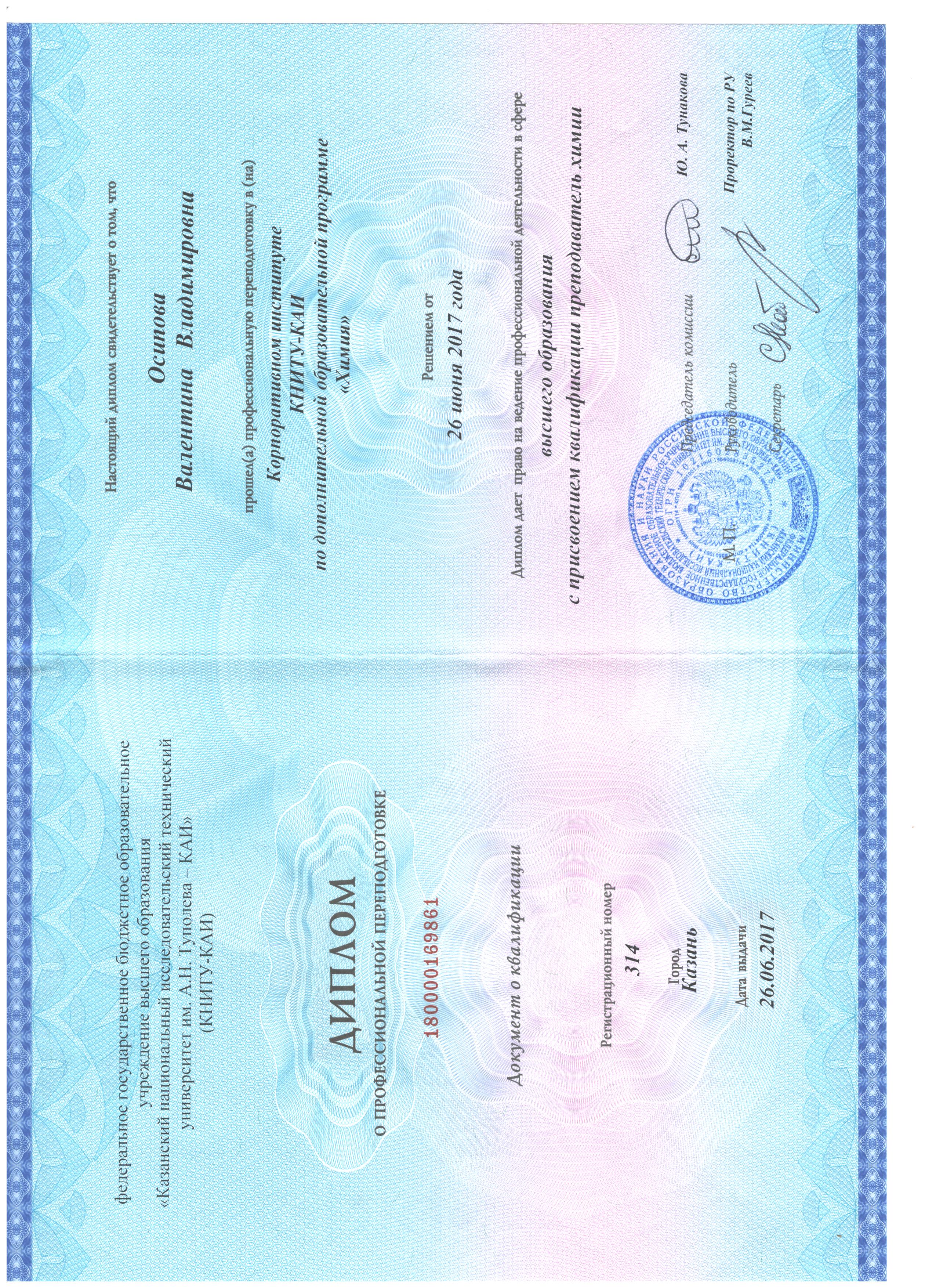 14.03.2017 - 26.06.2017, 510 час. Диплом о профессиональной переподготовке, номер: 180000169861. Выдан: ФГБОУ ВО "КНИТУ-КАИ". Программа: Химия.