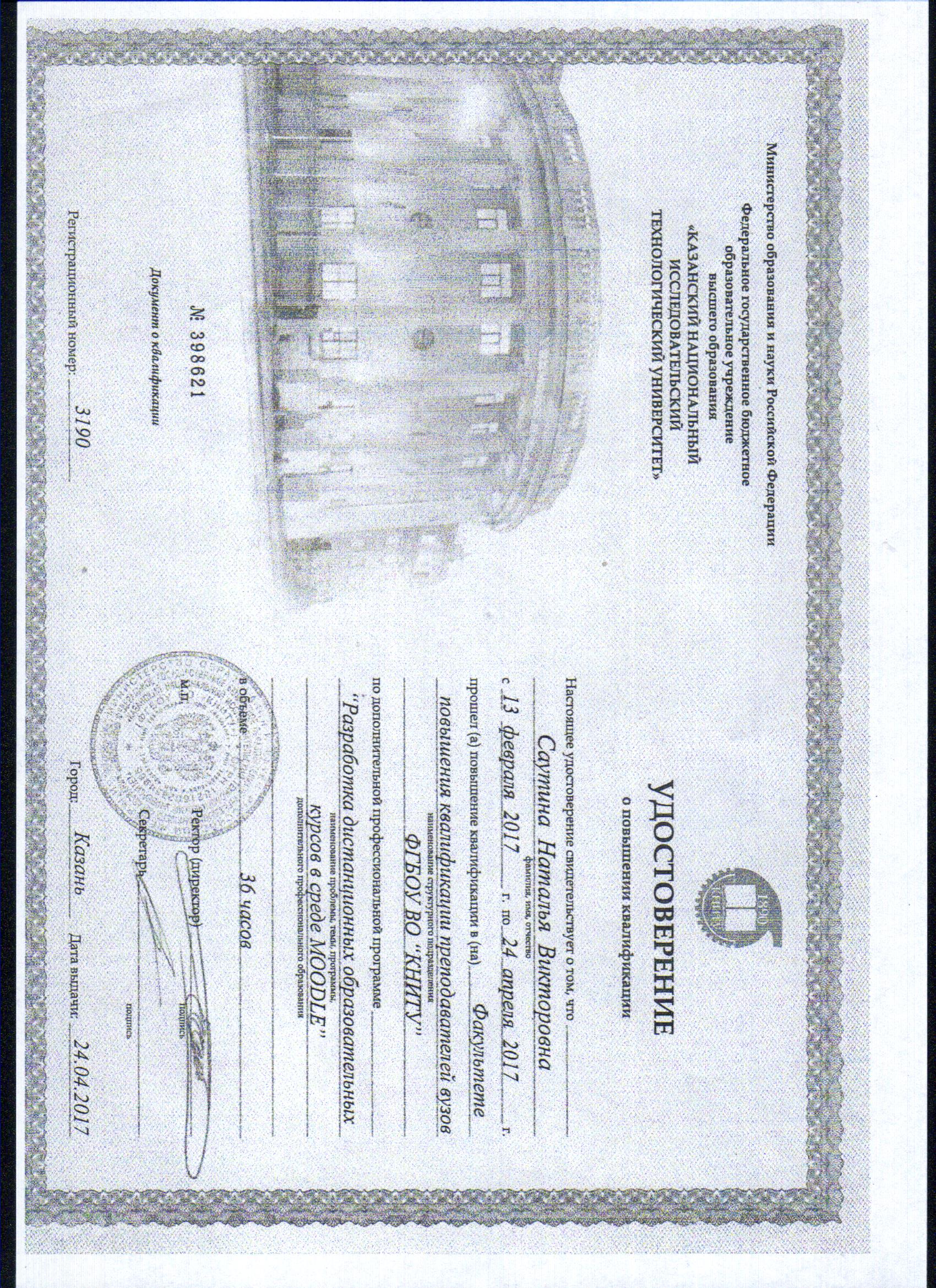 14.10.2024 - Удостоверение о краткосрочном повышении квалификации, серия: ПК, номер: 969583. Выдан: ИДПО ФГБОУ ВО "КНИТУ". Программа: Работа преподавателя в LMS Moodle.