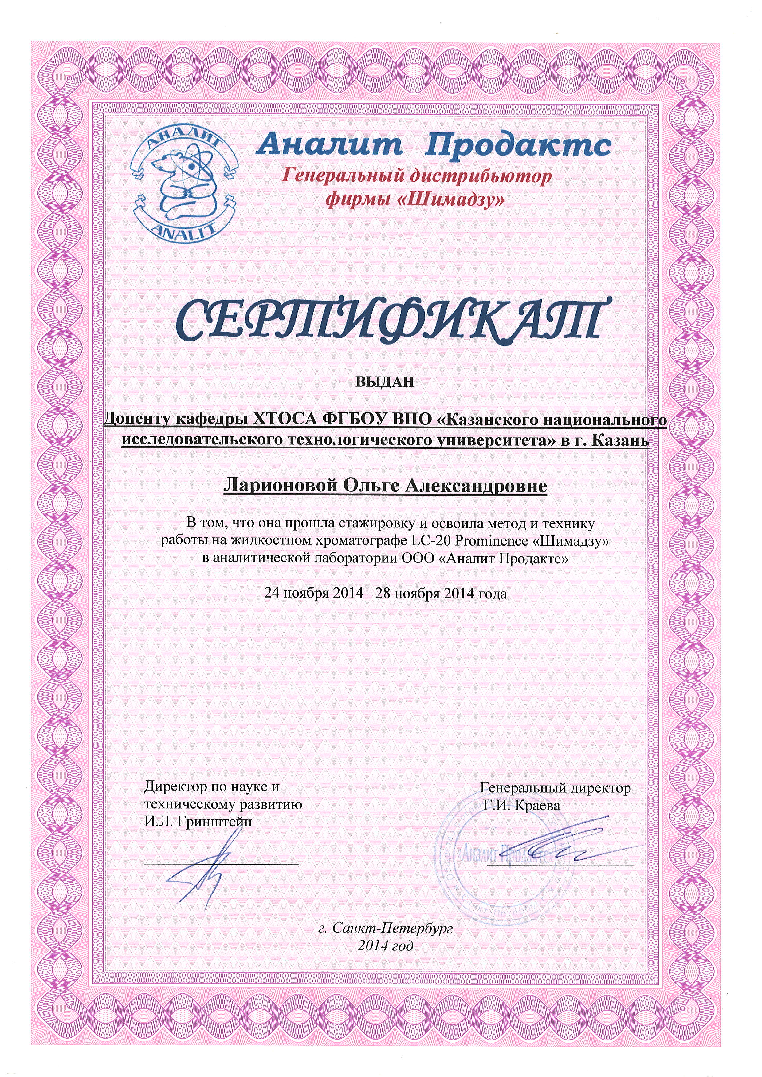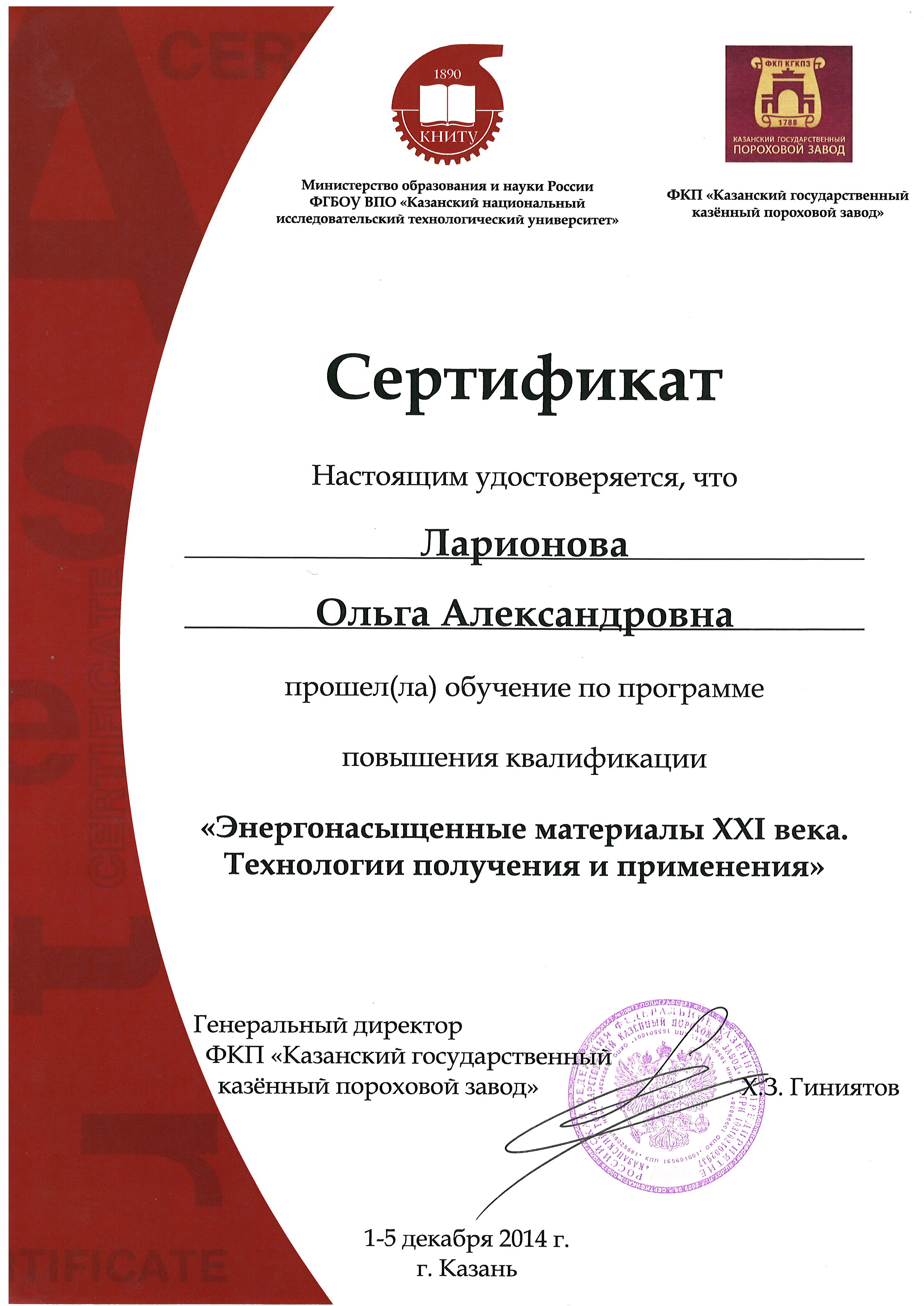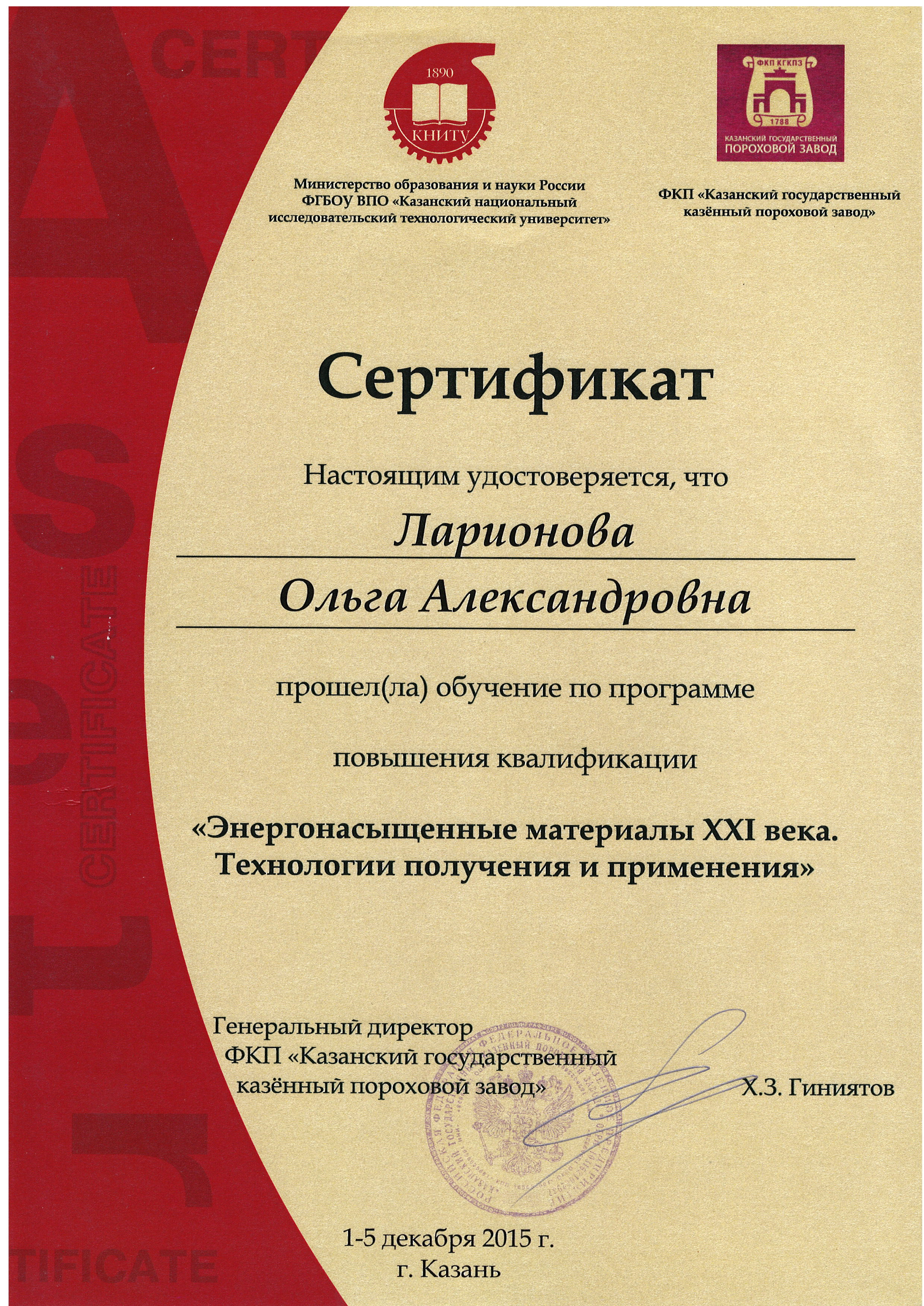 Диплом о высшем профессиональном образовании. Выдан: КГТУ. 04.07.2003. Квалификация: Магистр техники и технологии. Специальность: Химическая технология и биотехнология.