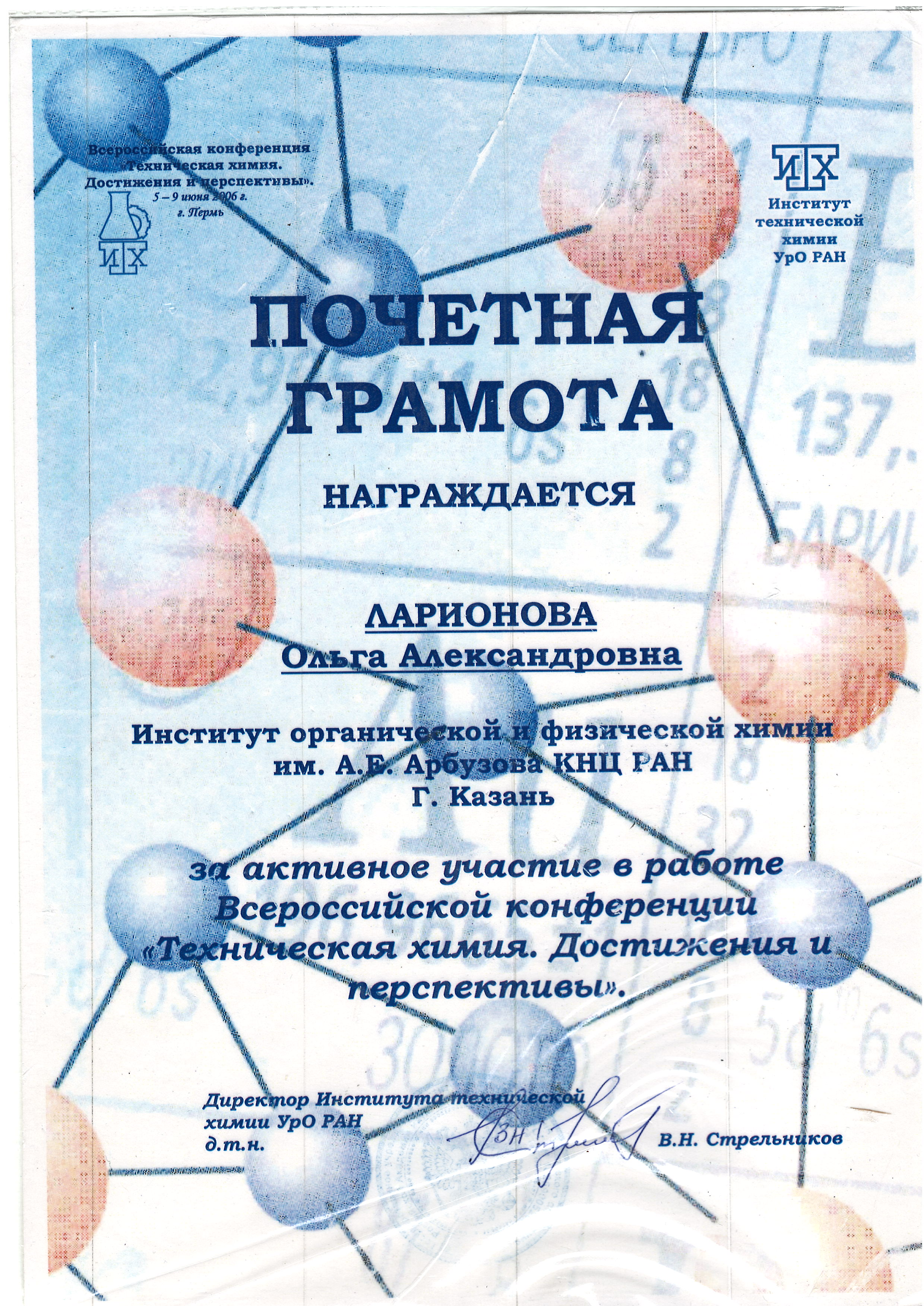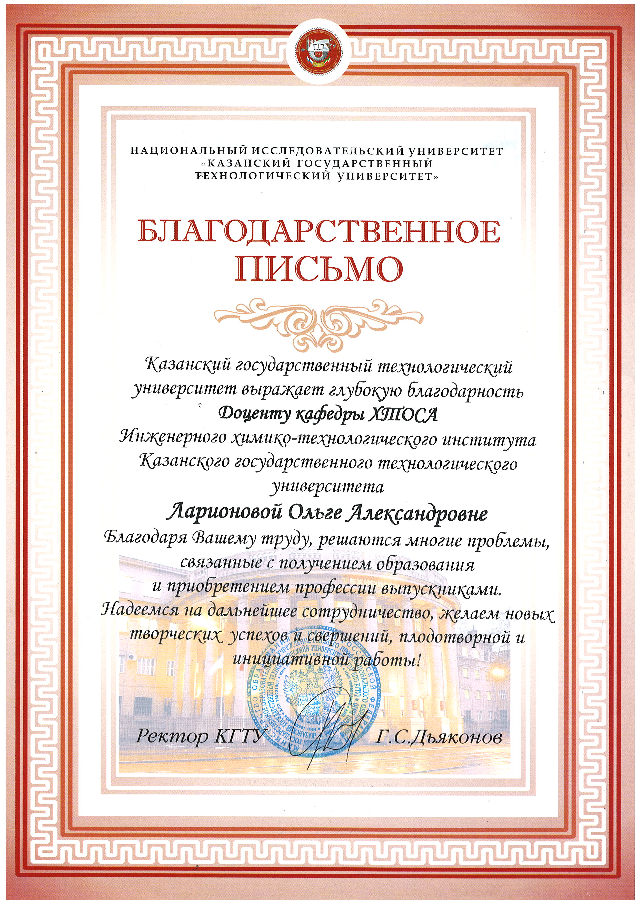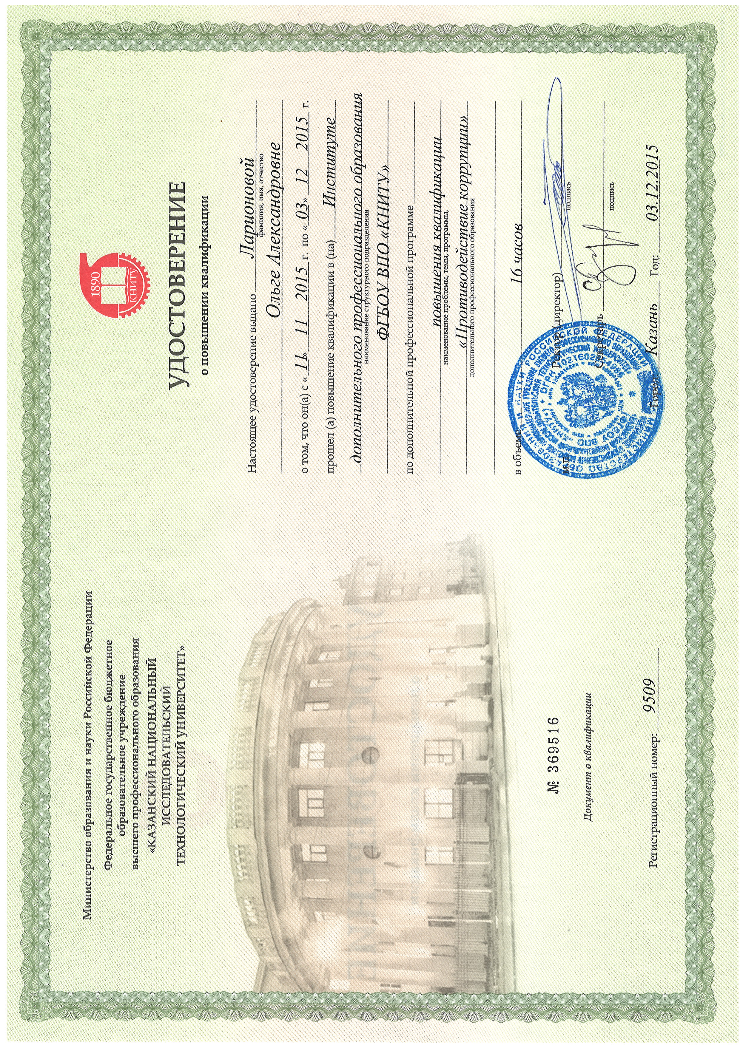 Диплом о высшем профессиональном образовании. Выдан: КГТУ. 04.07.2003. Квалификация: Магистр техники и технологии. Специальность: Химическая технология и биотехнология.