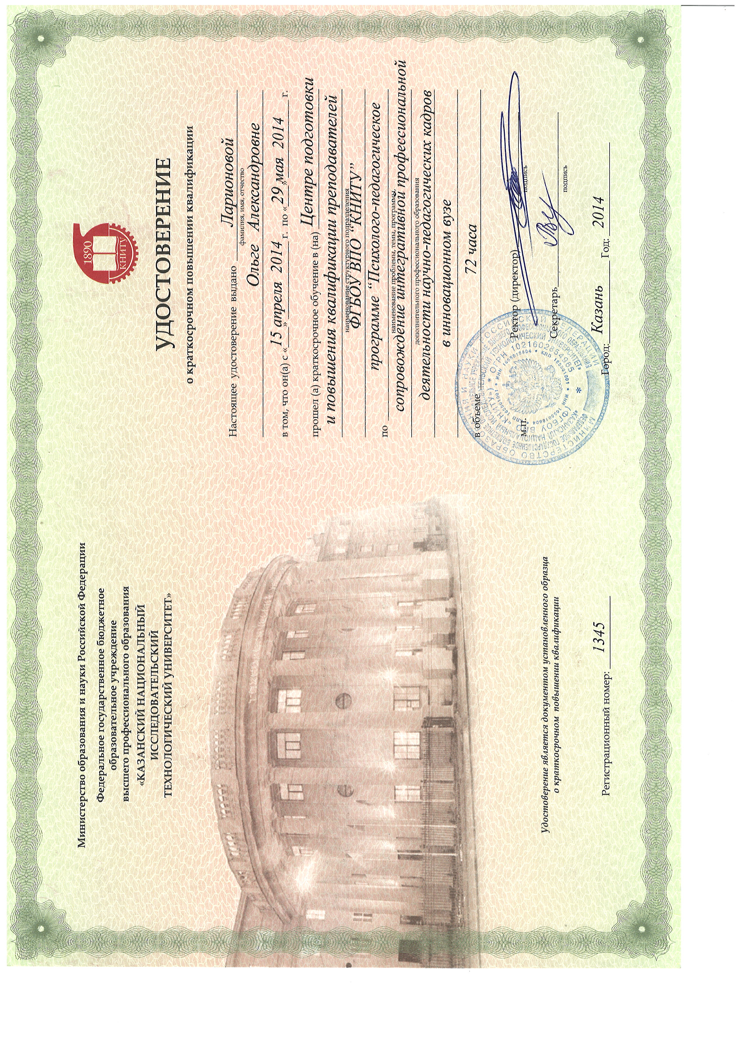 14.10.2024 - Удостоверение о краткосрочном повышении квалификации, серия: ПК, номер: 969587. Выдан: ИДПО ФГБОУ ВО "КНИТУ". Программа: Работа преподавателя в LMS Moodle.