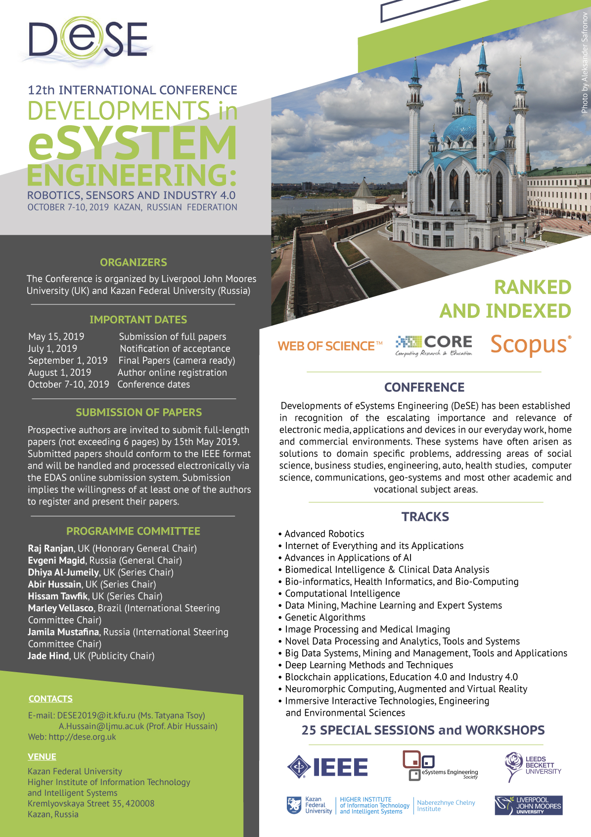 Основные темы конференции DeSE 2019 года - Робототехника, датчики, наука о данных и индустрия 4.0. Конференция является международной платформой для представления и обсуждения новых фундаментальных и прикладных исследований в области разработки электронных систем, робототехники, науки о данных, исследования больших данных, индустрии 4.0, машинного обучения и искусственного интеллекта, разработки интернета вещей и его приложений, включая интеллектуальное здравоохранение, умный город и умный дом, обучающую аналитику, анализ бизнес-данных и концепцию вычислительного облака. Конференция предоставляет ученым возможность презентации своих докладов и установления научных и образовательных контактов с коллегами из России и других стран. Доклады пройдут процедуру рецензирования международными экспертами, а принятые доклады будут опубликованы в сборнике трудов конференции, который будет включен в цифровую библиотеку IEEE Xplore и проиндексирован в базах данных SCOPUS и Web of Science. Избранные доклады будут приглашены для публикации расширенных версий в специальных выпуска журналов «Сенсоры» (квартиль Q2) и «Труды СПИИРАН» (квартиль Q4). Материалы DeSE 2019 будут проиндексированы IEEE-explore, SCOPUS и Web of Science Контакты: E-mail - DESE2019@it.kfu.ru (Ms. Tatyana Tsoy), A.Hussain@ljmu.ac.uk (Prof. Abir Hussain) |