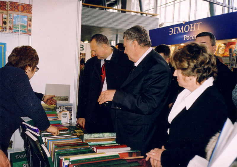 Фотомгновения выставочной жизни: стенд издательства Казанского государственного технологического университета (КГТУ); зам. председателя Госдумы РФ В.Ф. Жириновский знакомится с книжными новинками Татарстанского стенда; театрализованные персоны приглашают посетителей к стенду издательств Украины; выступление оперных солистов встречали возгласами "Браво!", "Бис!"; фейерверк ознаменовал торжественное открытие выставки-ярмарки; мини-читательская конференция, посвященная 100-летию со дня рождения Мусы Джалиля.