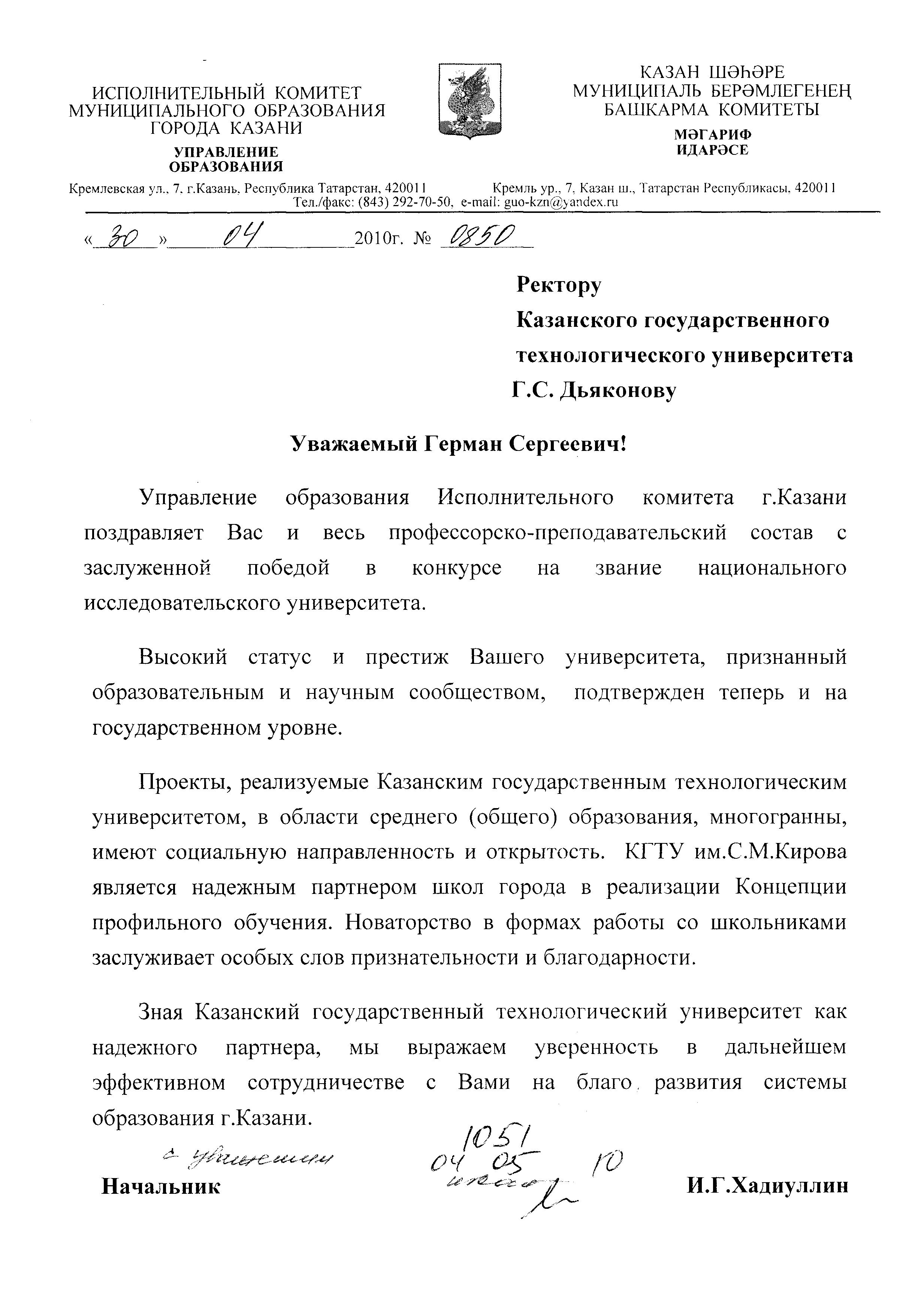 С уважением, начальник Управления образования Исполкома г. Казани Ильсур Гараевич Хадиуллин
