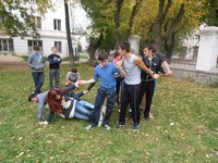 Интригой всего вечера был завершающий этап мероприятия. Всех посвященцев собрали перед входом в спортивный зал нашего ДАС. Каждому пришлось пройти огонь и воду, гром и медные трубы, в прямом смысле этого слова! С повязкой на глазах всех по-очереди впускали в зал. А там… Вокруг каждого создавались шумовые эффекты, затем его обливали водой, со словами: «Ты посвящен!», - обсыпали мукой и затем снимали повязку.