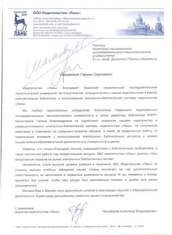 Издательство Лань прислало письмо, в котором благодарит КНИТУ за плодотворное сотрудничество