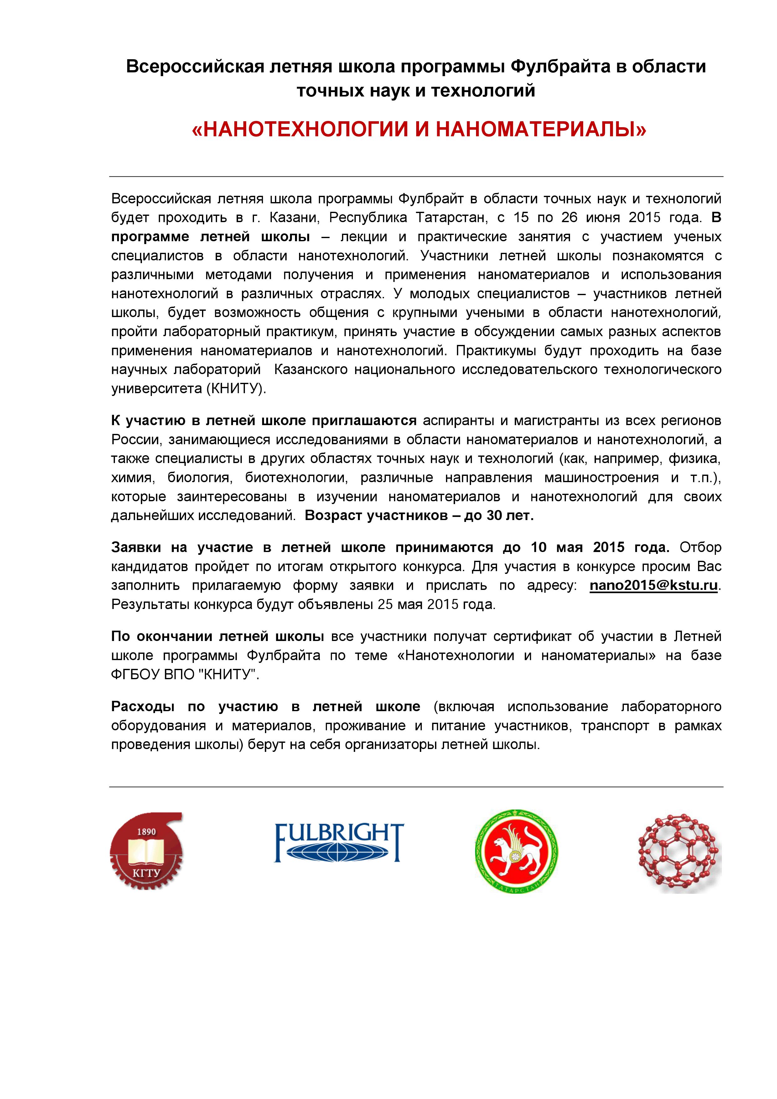 Заявки на участие принимаются до 10 мая 2015 года Всероссийская летняя школа программы Фулбрайт в области точных наук и технологий будет проходить в г. Казани, Республика Татарстан, с 15 по 26 июня 2015 года. В программе летней школы - лекции и практические занятия с участием ученых специалистов в области нанотехнологий. Участники летней школы познакомятся с различными методами получения и применения наноматериалов и использования нанотехнологий в различных отраслях. У молодых специалистов - участников летней школы, будет возможность общения с крупными учеными в области нанотехнологий, пройти лабораторный практикум, принять участие в обсуждении самых разных аспектов применения наноматериалов и нанотехнологий. Практикумы будут проходить на базе научных лабораторий Казанского национального исследовательского технологического университета (КНИТУ). К участию в летней школе приглашаются аспиранты и магистранты из всех регионов России, занимающиеся исследованиями в области наноматериалов и нанотехнологий, а также специалисты в других областях точных наук и технологий (как, например, , , биология, биотехнологии, различные направления машиностроения и т.п.), которые заинтересованы в изучении наноматериалов и нанотехнологий для своих дальнейших исследований. Возраст участников - до 30 лет. Заявки на участие в летней школе принимаются до 10 мая 2015 года. Отбор кандидатов пройдет по итогам открытого конкурса. Для участия в конкурсе просим Вас заполнить прилагаемую форму заявки и прислать по адресу: nano2015@kstu.ru. Результаты конкурса будут объявлены 25 мая 2015 года. По окончании летней школы все участники получат сертификат об участии в Летней школе программы Фулбрайта по теме «Нанотехнологий и наноматериалы» на базе ФГБОУ ВПО "КНИТУ".