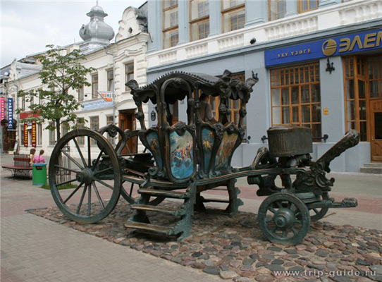 Что же касается учрежденных Петром I в Казани Адмиралтейства, кожевенного завода и суконной фабрики, то все это со временем было разрушено. В мае 1767 года в Казань пребыла Екатерина II, Для пребывания императрицы подготовили покои в доме купца Осокина. Дом, где останавливалась императрица, сохранился до наших дней (ныне ул. Рахматуллина,6).Позже в этом здании разместилась гостиница Дворянского собрания (кстати, 180 лет назад здесь останавливался Александр Пушкин!) Сейчас здание обнесено забором и терпеливо ждет реставрации. Кроме этого дома о пребывании Екатерины Великой в нашем городе напоминают два своеобразных памятника-макета – карета на улице Баумана По дороге из Казани в Симбирск императрица, как и Петр I, сделала остановку в Болгарах, отметив важность соблюдения требований своего предшественника о сохранении древнего поселения. После посещения Казани императрица увеличила финансирование Первой мужской гимназии и издала указ «спошествования к устроению каменных домов в Казани», которых действительно было немного. Позже, после разгрома города пугачевскими войсками, императрица пожертвовала большие средства на восстановительные работы. А 15 сентября 1786 года по ее повелению был основан казанский пороховой завод. «Звучи, о арфа, ты все о Казани мне, звучи, как Павел в ней явился благодатен». Такие строки, рифмой-продолжением которых является знаменитое «Отечества и дым нам сладок и приятен», возникли у Державина по поводу приезда Павла I в Казань в конце мая 1798-го. Император вместе со своими сыновьями – великими князьями Константином и Александром – прибыл в наш город с целью осмотра войск оренбургской военной экспедиции. Примечательно, что Павел I стал единственным из навещавших Казань императоров, в категоричной форме отказавшимся от пышных приемов. Поэтому встречали царя повсеместно лишь хлебом-солью (правда, на серебряных позолоченных блюдах с вензелем и с золотыми солонками). По окончании визита Павел I получил от местного купечества известные местные «бренды»: знаменитое казанское мыло и изделия из кожи. Пребывание августейших особ ознаменовалось многими милостями, «каковых в Москве и в прочих городах не было», по словам современника той эпохи. Прежде всего Павел повелел присоединить к Казани значительное количество выгона земли, леса и лугов, расширив городские границы. Еще он распорядился выдать беспроцентную ссуду в 200 тысяч рублей из губернаторских доходов с рассрочкой на десять лет на постройку нового Гостиного двора. Отмечено участие императора в закладке собора Казанского Богородицкого монастыря – он собственноручно положил первый камень в основании будущего храма и пожертвовал 25 тысяч рублей на строительство. 10 тысяч рублей Павел выделил на постройку новых лазаретов. Еще городу была пожалована мельница на Казанке и баня на Булаке, а под помещение гимназии отдан обширный губернаторский дом на Воскресенской улице. К сожалению, не сохранился дом генерала Лецкого, где останавливался император, но казанцы хорошо знают Лядской садик на улице Горького, который когда-то соседствовал с генеральским жильем. Кстати, именно Павел I повелел именовать улицу, на которой стоял приютивший его особняк, улицей Лецкого. В 1923 году она была переименована в Большую Галактионовскую, а в 1949 году получила имя Горького. Ещ