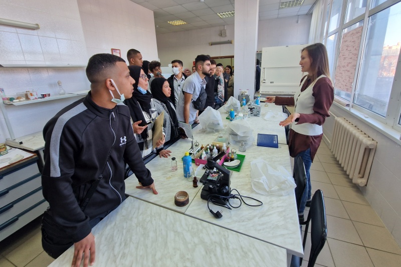 Приехав в Казань из разных стран, студенты в течение года изучают русский язык и профильные предметы на кафедре РКИ с тем, чтобы поступить в один из вузов Казани. Целью экскурсии стало открытие для слушателей ФМОП, изучающих биологию и химию, новых для них «неклассических» образовательных программ биомедицинской направленности, реализуемых в нашем университете: Биотехнические системы и технологии (Медицинские изделия и технологии, Медикобиологические технологии) и Биотехнология (Фармацевтическая биотехнология).